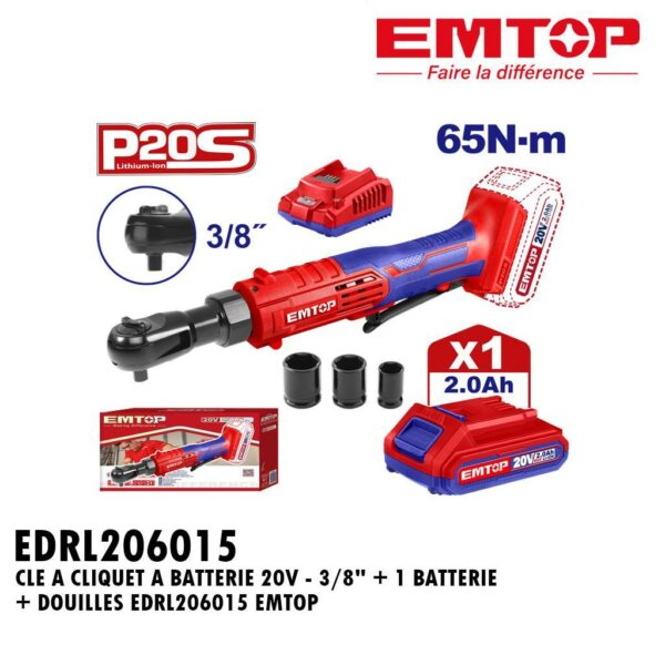 CLE A CLIQUET A BATTERIE 20V – 3/8″ + 1 BATTERIE + DOUILLES EDRL206015 EMTOP