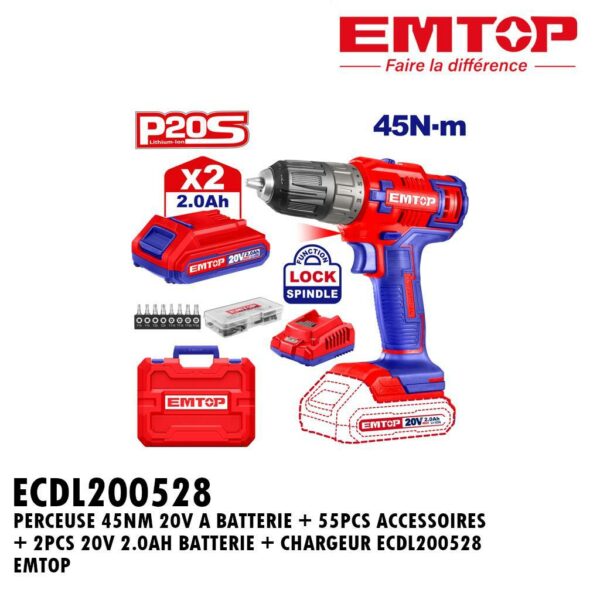 PERCEUSE 45NM AVEC 55PCS + LED 2.0AH LI-ION ECDL200528 EMTOP