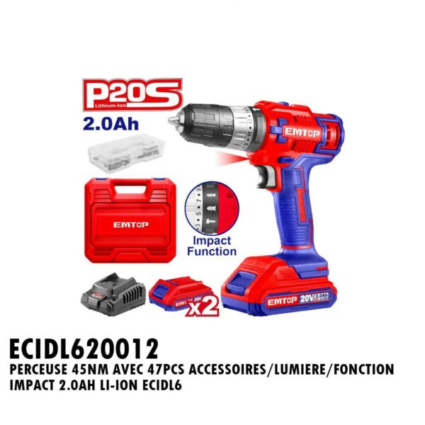 PERCEUSE 45NM AVEC 47PCS ACCESSOIRES/LUMIERE/FONCTION IMPACT 2.0AH LI-ION ECIDL6