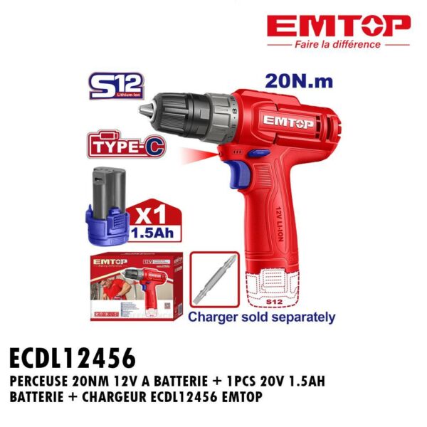 PERCEUSE 20NM 12V A BATTERIE + 1PCS 20V 1.5AH BATTERIE + CHARGEUR ECDL12456 EMTOP