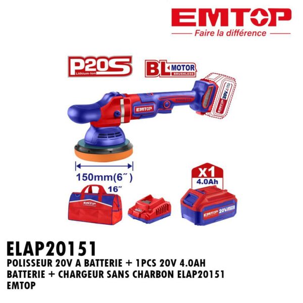 POLISSEUR 20V A BATTERIE + 1PCS 20V 4.0AH BATTERIE + CHARGEUR SANS CHARBON ELAP20151 EMTOP