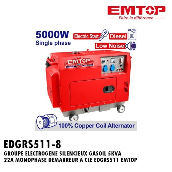GROUPE ELECTROGENE SILENCIEUX GASOIL 5KVA 22A MONOPHASE DEMARREUR A CLE EDGRS511 EMTOP