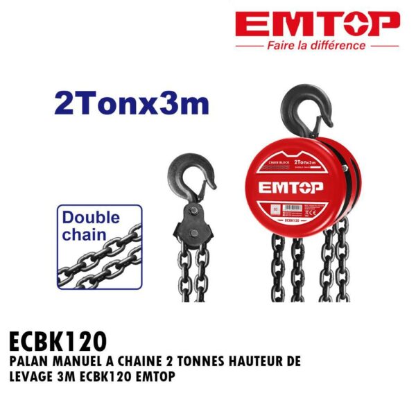 PALAN MANUEL A CHAINE 2 TONNES HAUTEUR DE LEVAGE 3M ECBK120 EMTOP