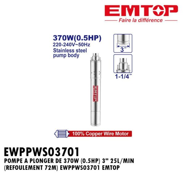 POMPE A PLONGER DE 370W (0.5HP) 3″ 25L/MIN (REFOULEMENT 72M) EWPPWS03701 EMTOP