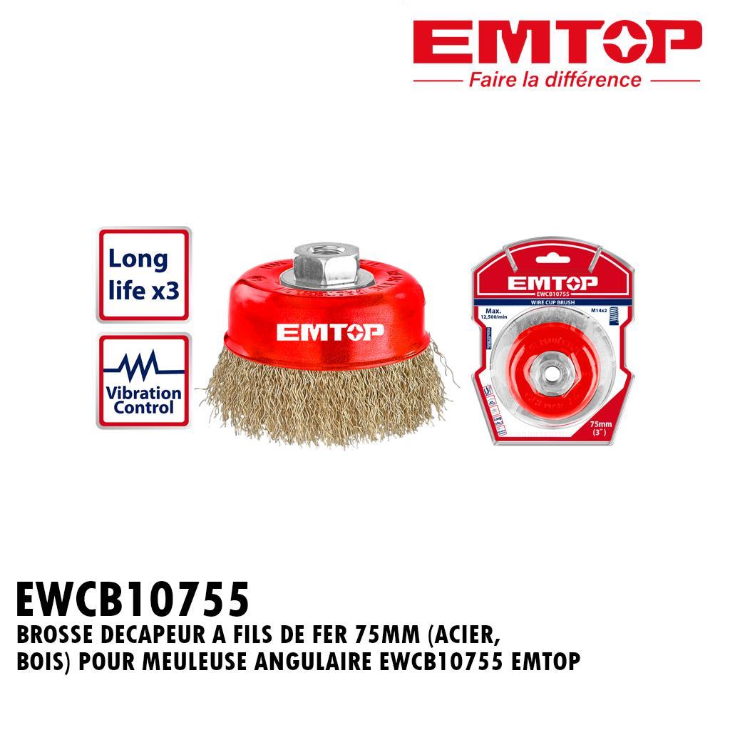 BROSSE DECAPEUR A FILS DE FER 75MM (ACIER, BOIS) POUR MEULEUSE ANGULAIRE EWCB10755 EMTOP