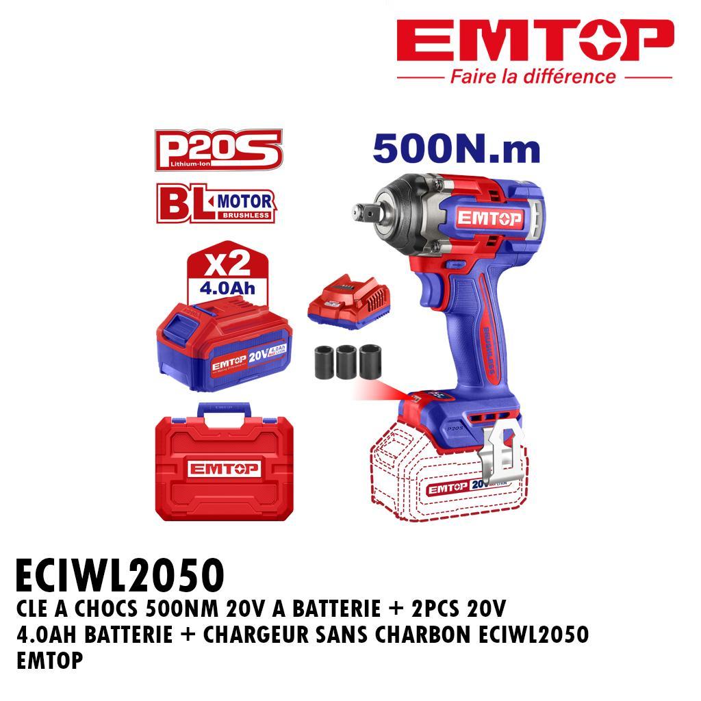 CLE A CHOCS 500NM 20V A BATTERIE + 2PCS 20V 4.0AH BATTERIE + CHARGEUR SANS CHARBON ECIWL2050 EMTOP