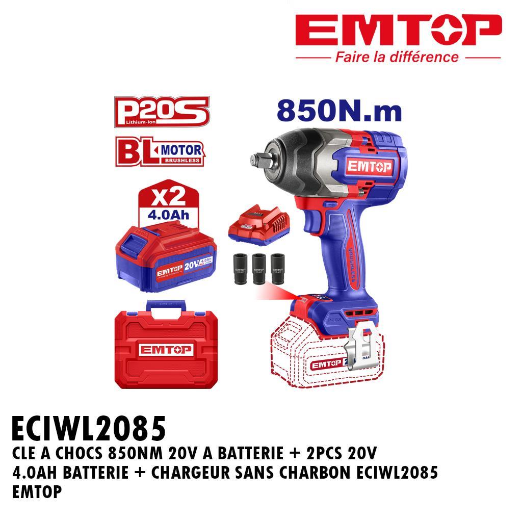 CLE A CHOCS 850NM 20V A BATTERIE + 2PCS 20V 4.0AH BATTERIE + CHARGEUR SANS CHARBON ECIWL2085 EMTOP