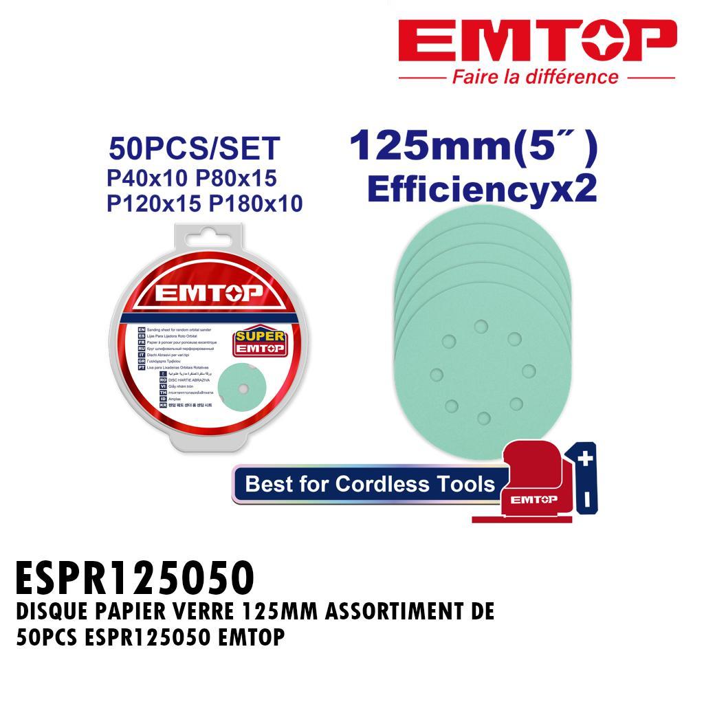 DISQUE PAPIER VERRE 125MM ASSORTIMENT DE 50PCS ESPR125050 EMTOP