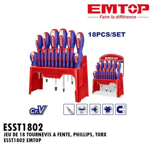 JEU DE 18 TOURNEVIS A FENTE, PHILLIPS, TORX ESST1802 EMTOP