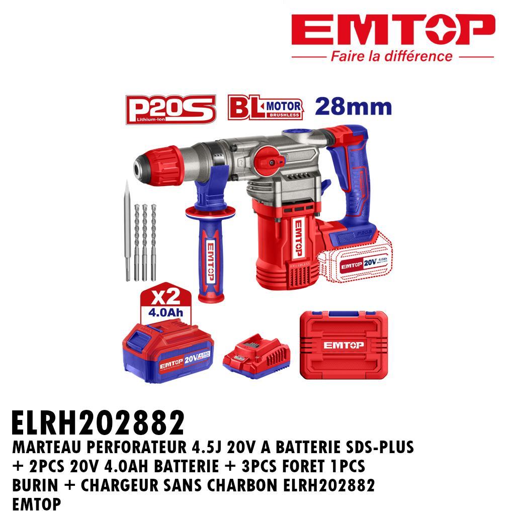 MARTEAU PERFORATEUR 28MM 20V A BATTERIE SDS-PLUS + 2PCS 20V 4.0AH BATTERIE + 3PCS FORET 1PCS BURIN + CHARGEUR SANS CHARBON ELRH202882 EMTOP