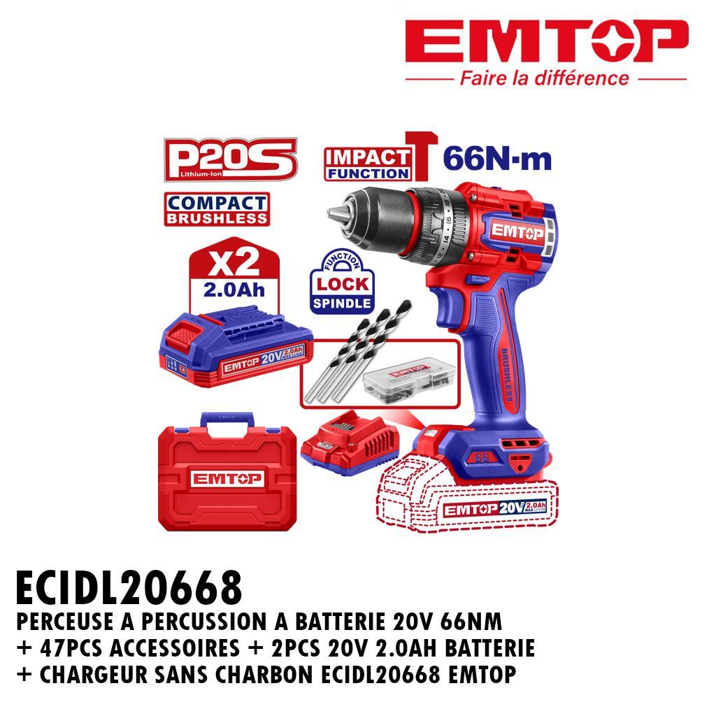 PERCEUSE A PERCUSSION A BATTERIE 20V 66NM + 47PCS ACCESSOIRES + 2PCS 20V 2.0AH BATTERIE + CHARGEUR SANS CHARBON ECIDL20668 EMTOP