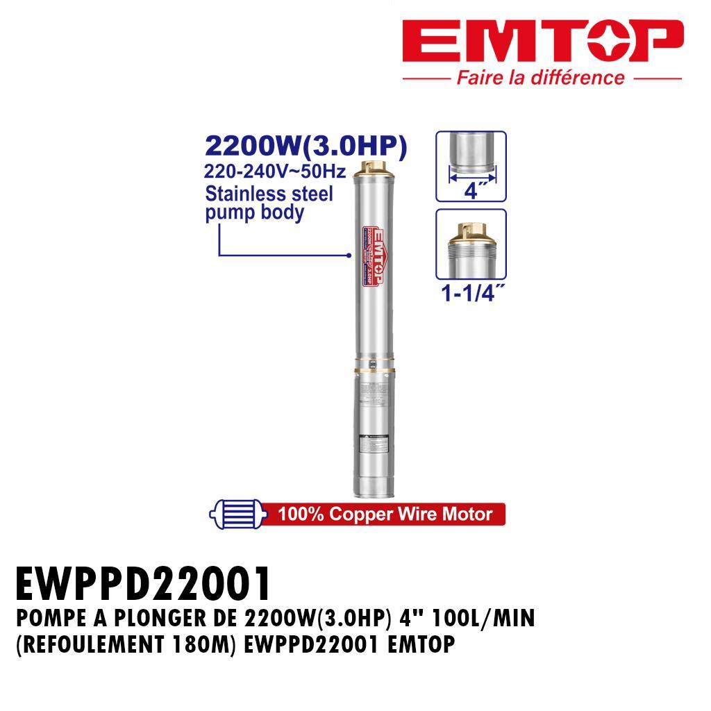 POMPE A PLONGER DE 2200W(3.0HP) 4″ 100L/MIN (REFOULEMENT 180M) EWPPD22001 EMTOP