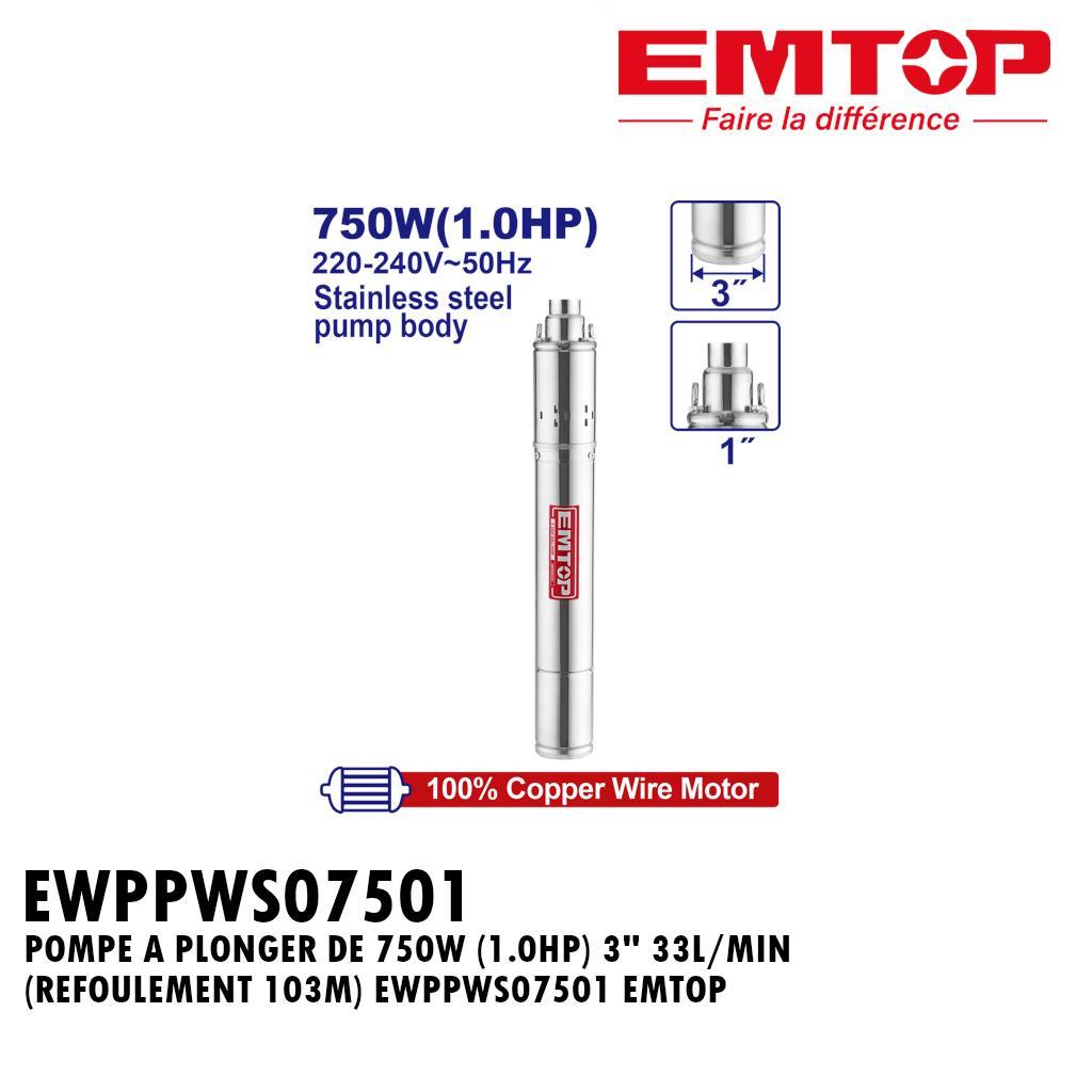POMPE A PLONGER DE 750W (1.0HP) 3″ 33L/MIN (REFOULEMENT 103M) EWPPWS07501 EMTOP