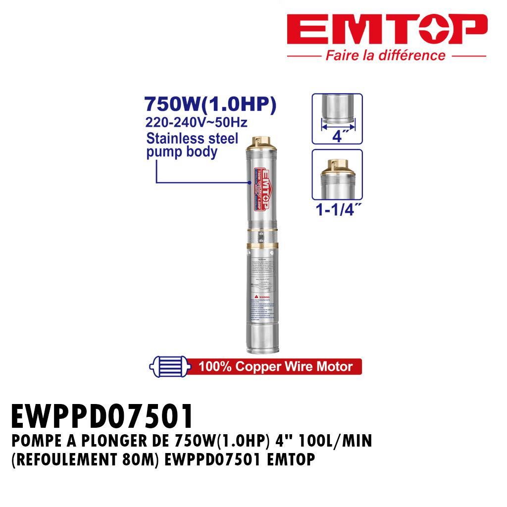 POMPE DE PUITS PROFOND DE 4″ 750W(1.0HP) 6.0M³/H EWPPD07501 EMTOP