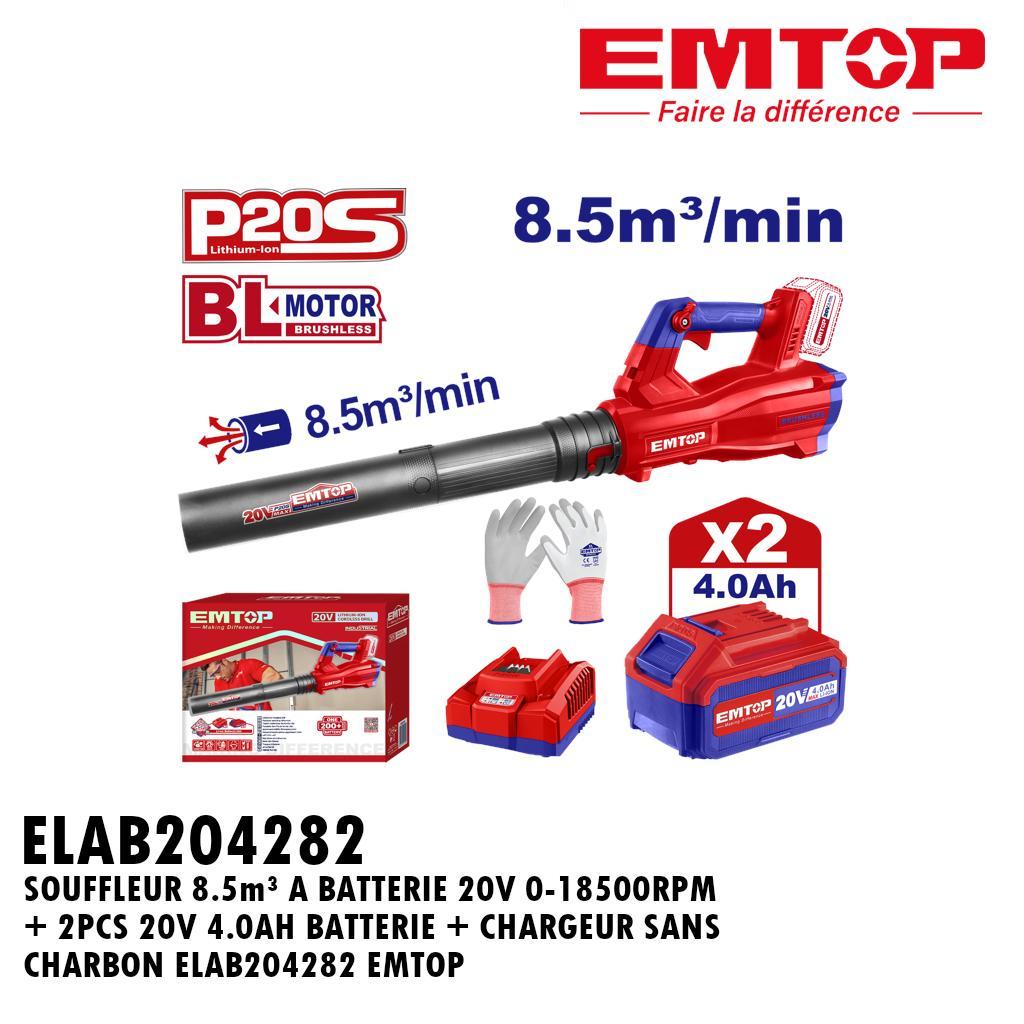 SOUFFLEUR 8.5㎥ A BATTERIE 20V 0-18500RPM + 2PCS 20V 4.0AH BATTERIE + CHARGEUR SANS CHARBON ELAB204282 EMTOP