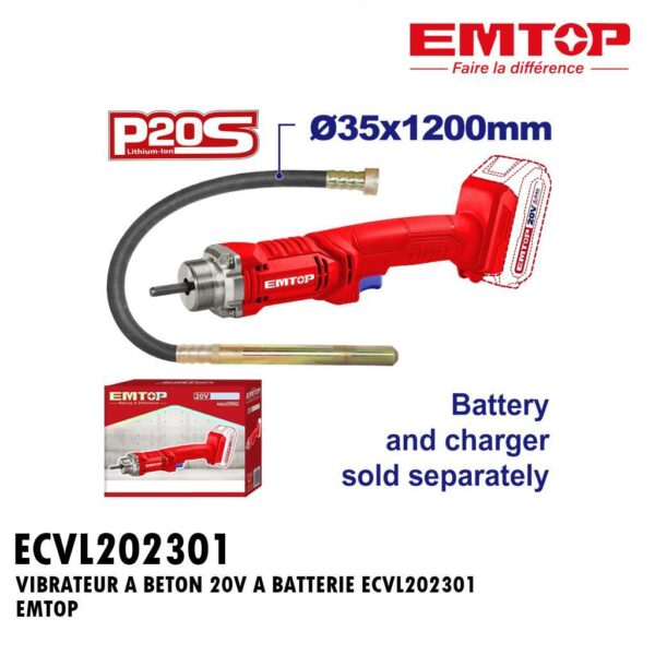 VIBRATEUR A BETON 20V A BATTERIE + 2PCS 20V 2.0AH BATTERIE + CHARGEUR ECVL2023013 EMTOP