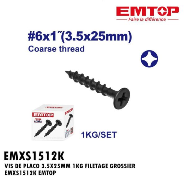 VIS DE PLACO 3.5X25MM 1000PCS FILETAGE GROSSIER EMXS1512 EMTOP